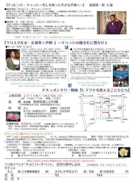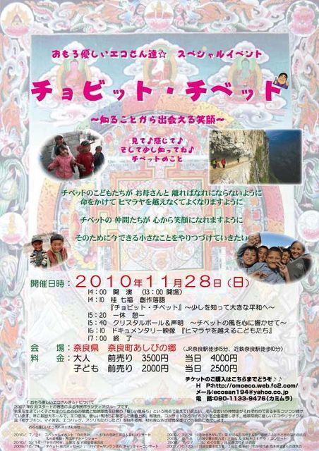 管理人様 いつもありがとうございます。 秋の『おもろ優しいエコさん達☆』はチベット支援を させていただきます チベット落語と クリスタルボール演奏&声明 と ドキュメンタリー映像 ************************************************************** 『 チョビット・チベット 〜少しを知って大きな平和へ〜』 世界初 浪花初 難しいと 敬遠されがちな チベット落語を 上方落語家 桂 七福師匠が 落語にしてくださいました エリザベスは この落語をみたとき とても感動しました チベットのことを こんな風にして