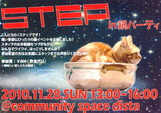 こんにちわーSTEPです! さてさて、11月の企画のお知らせです! 11月の開催とはいいつつも、多分2010年最後のSTEPになると思います! 今回のSTEP企画は、今日までSTEPを支えてくれた全ての人にお送りする 時期的にもぴったりのパーティ企画! 【鍋パーティ】を開催します! 冬に大勢で食べるモノの定番と言えば…鍋! 今回のSTEPでは、2010年を駆け抜けた全ての若ゲイに向けたオツカレ鍋会でもあります。 気軽に参加できる!(途中退場・参加自由) 参加費も安め設定!(800円!) 新しい友達・彼氏も出来ちゃう?!(クリスマス
