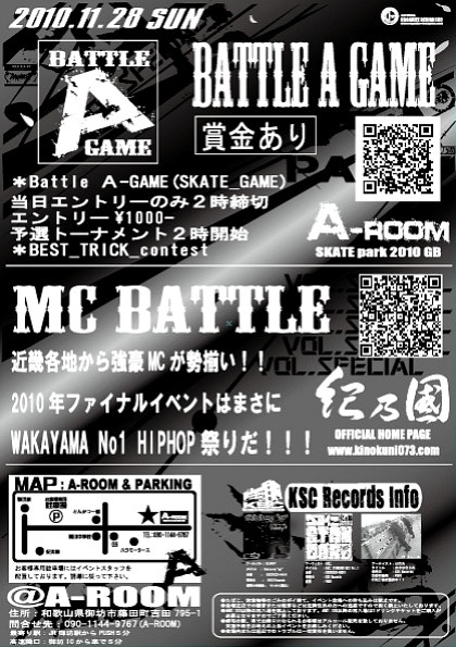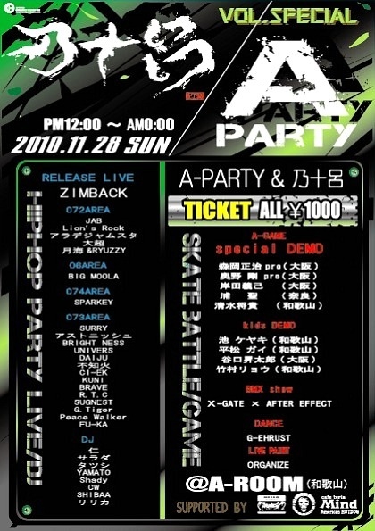 ありがとう、A-ROOM...。 これが紀乃國から最後の手向けだ。 さぁ、 待ち望んだこの日が来た! 和歌山は御坊が誇る屈指のエンターテイナー夢のコラボがついに、ついに実現! “A-ROOM & 紀乃國”渾身の合作! A-PARTY & 乃十呂!!!! HIPHOP LIVE/DJはもちろん、 近畿各地から強豪MCがひしめき合うFREESTYLE MC BATTLE! さらにはスケボーNo.1を決めるトーナメント、BATTLE A-GAMEも満 を持しての開催!! 大人からちびっ子まで楽しめるデイイベントはがっつり12時間、メガ盛りサイズ の豪華ラインナップ!! 2010年も