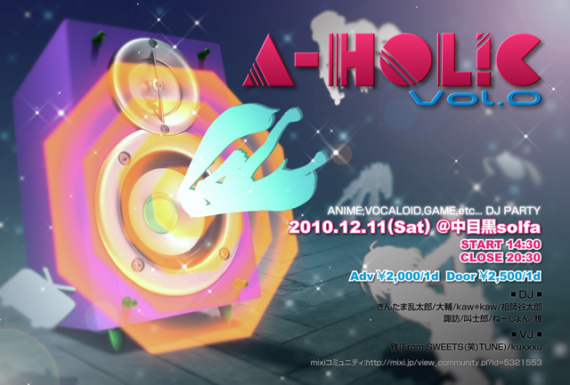 ■■■A-HOL!C vol.0 〜正しい年末の過ごし方〜■■■ アニソンを主軸に、ニコソン、ボカロ、電波、アニソンREMIXをゴチャ混ぜにしたアニソンDJイベント! 土曜の昼からオサレな中目黒の街をアニソンでジャック!!! ■概要 HOLIC=中毒者、という意味の通り、アニメやニコ動がなければ生けていけない重度の中毒者達が集結し、平和な土曜日のお昼をカオスな空間にしちゃおう!そんな意気込みから誕生したのが、この「A-HOL!C 」です。 今回が初となるイベントですが、これから成長してくイベントするためのベースを作るという意味でvol.1では