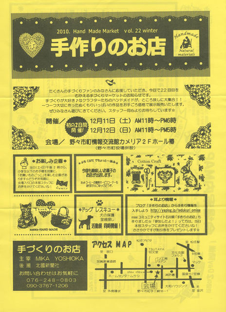 12月11日(土曜)11時〜18時 12月12日(日曜)11時〜17時 場所…野々市町役場併設カメリア2階 ホール椿 今回は2日間の開催です 1日目と2日目と参加メンバーがちがいます。 コミュ参加メンバーには、お買いもの割引券(100円)プレゼント ⇒当日会場にて、mixi参加名をお伝えください! 手づくりのお店 mixiコミュ http://mixi.jp/view_community.pl?id=5019407