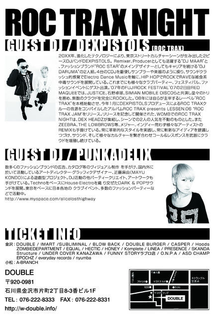 管理人様、告知失礼します。 2010.12.25(sat) @DOUBLE 石川県金沢市方町2-8-3 香ビル2F,1F,B1F TEL:076-222-8333 http://w-double.info/mobile/index.html ADV:3000yen DOOR:3500yen (※ドリンク別途500円) OPEN/START 22:00〜 ROC TRAX NIGHT -double x'mas event- ■SPECIAL GUEST DJ DEXPISTOLS ■SPECIAL GUEST DJ PUNKADELIX ■MAIN FLOOR DJs K4!! Gon’z KENKEN PROFILE:DEXPISTOLS (ROC TRAX) 20XX年、進化したテクノロジーにより、東京ストリートカルチャーシー