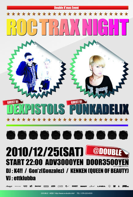 2010.12.25(sat) @DOUBLE 石川県金沢市方町2-8-3 香ビル2F,1F,B1F TEL:076-222-8333 http://w-double.info/mobile/index.html ADV:3000yen DOOR:3500yen (※ドリンク別途500円) OPEN/START 22:00〜 ROC TRAX NIGHT -double x'mas event- ■SPECIAL GUEST DJ DEXPISTOLS ■SPECIAL GUEST DJ PUNKADELIX ■MAIN FLOOR DJs K4!! Gon’z KENKEN PROFILE:DEXPISTOLS (ROC TRAX) 20XX年、進化したテクノロジーにより、東京ストリートカルチャーシーンが生み出した2ピースDJバンドDEXPISTOL