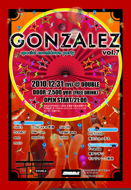2010.12.31(fri) @DOUBLE 石川県金沢市方町2-8-3 香ビル1F,B1F TEL:076-222-8333 http://w-double.info/mobile/index.html DOOR:2500yen(FREE DRINK!!!!) OPEN/START 21:00〜 ※当日はOPENの21:00から朝まで飲み放題です Gonzalez vol.7 -special countdown party- ■DJ's Gon’z DONNY emo moco 死神 a.k.a DJ U-SK Mer Lion MARGO SAORI LittleCalina NAMI ■VJ PISTON9 滝川クルッテル ■Performance T-rumble 鼻チンチン モッツァレラ姉妹 今回のGonzalezはCountDownからのNewYearParty