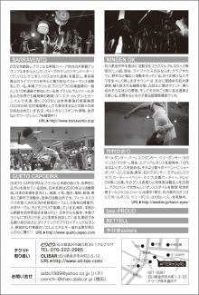 管理人様,告知失礼致します. 今週末に迫りましたイベント, ブラジリアンパーカッションとダンスのコラボクラブイベント CARUNGA(カルンガ) 〜音楽とダンスを融合したブラジルフェスタ〜 の告知です. 12月11日(土) オープン/20:00 スタート/20:30 前売り/2500円 当日/3,000円(1ドリンクつき) レゲエとサンバがミックスされたNEWミュージック!!超爆音で体が勝手に動き出す! BARRAVENTO http://www.barravento.org/ 見たこともないような体の動きを目撃しよう! GUETO CAPOEIRA http://www.gueto-japao.