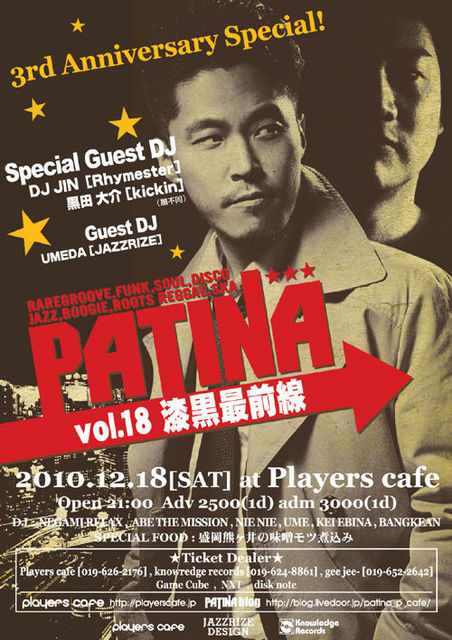 2010 12/18(SAT) 21:00start ◎盛岡生音天国◎ [PATINA -パティーナ-] vol.18 ☆3周年スペシャル☆ -RAREGROOVE,FUNK,SOUL,DISCO BOOGIE,JAZZ, ROOTS REGGEA,SKA- ■SPECIAL GUEST DJs ◇DJ JIN(RHYMESTER) http://www.rhymester.jp/ ◇黒田 大介(kickin) http://wahwah-blog.blogspot.com/ http://www.sostokyo.com/searching/ (順不同) ■GUEST DJ ◇UMEDA(JAZZRIZE) http://www.jazzrize.com/ ■DJs NEGAMI RELAX,ABE THE MISSION, NieNie,UME,KEI EBINA,BANGKEAN ▲SPECIAL FOOD 盛岡熊ヶ井