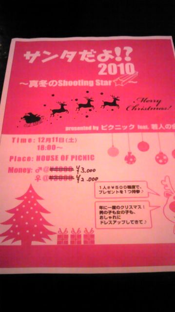 12月に入りました 今年も残り1ヶ月過ぎましたねぇ〜 もうすぐXmas ひとあし、早くピクニックでパーティーしませんか 参加は誰でもOK 年齢も職業も問いませんいろんな垣根を越えてみんなで仲良く楽しんじゃいましょー ステキな出会いもあるかも 12月11日(土曜日) 場所 HOUSE OF PICNIC 時間 18:00〜スタート★ Ticket Men's ¥3000 Lady's ¥2000 内容 2時間半の飲み放題!!! プレゼント交換をしたいのでおひ