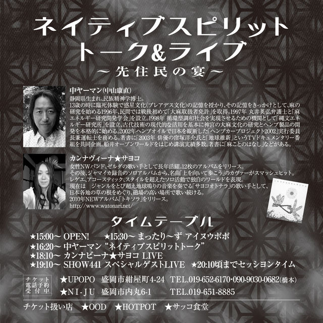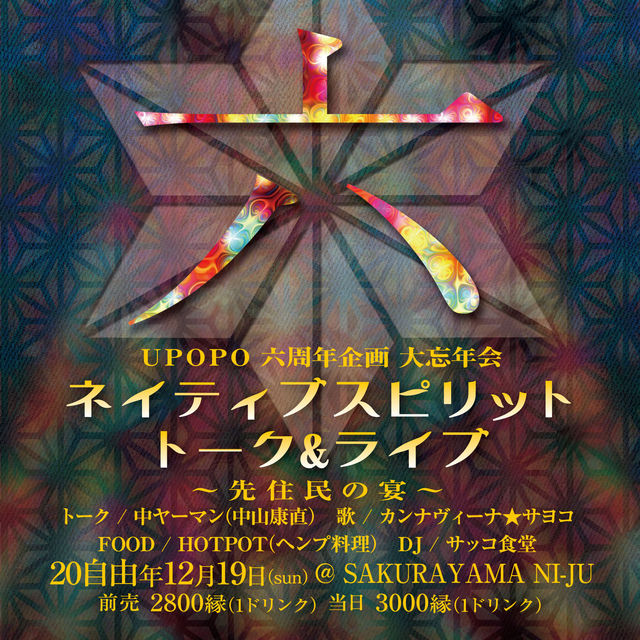 いよいよ忘年会の季節になりましたね! UPOPOでは6周年を記念して大忘年会を開催いたします。 NI−JUも6周年で一緒に祝おう!と思います。 あのサヨコと中ヤーマンを招いて ネイティブスピリットトーク&ライブ 先住民の宴を一緒に! 2,0自由年 12月19日(日曜日) 午後3時から 前売2800縁 当日3000縁 FOOD HOTPOT ヘンプ料理 電話予約受付け中です。 〜先住民の宴〜 今年はどんな感じで終