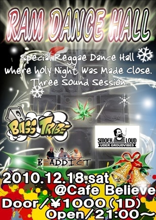 『 RAM DANCE HALL 』 2010.12.18 (Sat) @Cafe.Believe Door.\1000(1D) Open.21:00〜 《 SOUND 》 BASS TRIBE with SOUND SYSTEM B-ADDICT SMOKE LOUD Fr.HACHINOHE 今回はSOUNDSYSTEMを入れてのDANCEなので爆音でGOOD!!なReggaeMusicが楽しめますよ♪ 地元を中心にDANCEをキープし今年SOUNDSYSTEMをリニューアルしたBassTrive! 久慈、盛岡、石巻と精力的に活動しているB-ADDICT! 八戸のレゲエシーンを牽引しているSmokeLoudの3SOUND SESSION!! 何が起こるかわからない。期待出来るDANCE