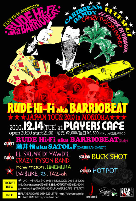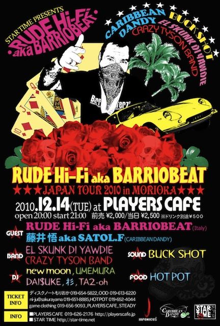 告知失礼いたします。 イタリアのボローニャ出身、シンガー・DJ・プロデューサー・リミキサー・MCをこなすマルチアーティスト、RUDE HI-FI aka BARRIOBEAT(ルーデ・ハイ・ファイ・バリオビート)の待望の再来日、盛岡公演が決定! 昨年のフジロック出演を含むジャパン・ツアーでは、圧倒的な存在感と泣く子も黙る男気トースティングで、各地がPACHANGA PARTYに。。。 今回の盛岡公演では、イタリアの番長と盛岡レゲエ番長が共演!! RUDE & CARIBBEAN DANDY meets BUCK SHOT! &&& エルスカンクとクレイジー・タイソン・バンドも参加でさら