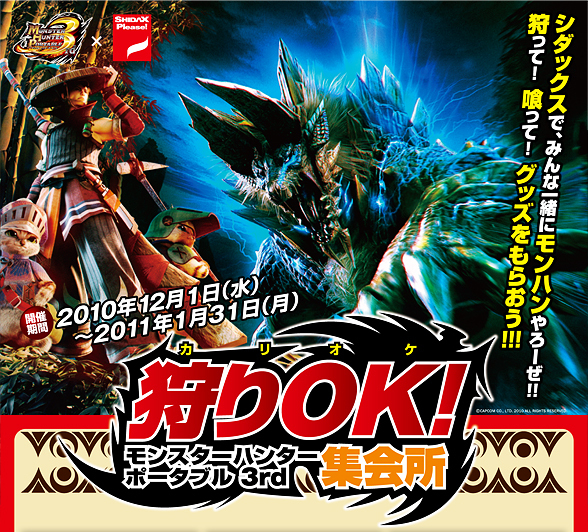 今シダックスでモンハンコラボイベントをやっています。 http://www.shidax.co.jp/sc/otoku/monhun/ これに行きたい! ということで、シダックスモンハンコラボオフを募集します。 コースはモンハンパック(1000円)+オトモセット(1000円)=2000円 こんがり肉とかギルドピザとか食いたい人は別途各人払いで注文すること。 日時:2010年12月25日(土)12時30分現地シダックスロビーに集合、13時より入室 場所:シダックス 静岡両替町クラブ http://yoyaku.sdx.co.jp/pc/shopinfo_59160.html 募集締め切り:2010年12月24日(