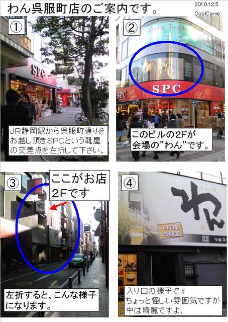 ★会場へのアクセス写真を3枚目にUPしました お越しの際一度ご確認をお願いします。↑ 大変お待たせしました。 ★第37回平日飲み会in静岡★のご案内です。 ~~~~~~~~~~~~~~~~~~~~~~~~~~~~~~~~~~~~~~~~~ 当会の幹事を仰せつかりましたCoolCarveでございます。 若輩者の私が、初めての幹事で緊張しており、皆様の暖かなご協力を頂き 皆様が年末を楽しく過ごせるよう頑張ってまいります。 宜しくお願いします。 ---------- 日時:平成22年12月15日(水曜日)20:00〜(19:45受付開始) 場所:くいもの屋 わ
