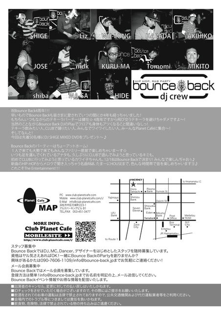 祝Bounce Back4周年!!! 早いものでBounce Backも皆さまに愛されていつの間にか4年も経っちゃいました! もちろんいつもながらのテキーラパーチーは健在☆ 4周年ですから飛び交うテキーラを避けちゃダメですよ〜! 当然のことながらBounce Back DJのPlayでフロアも身体もアツくなること間違いなしっ! テキーラ飲みたい人、CLUBで踊りたい人、みんなでワイワイしたい人、みーんなPlanet Cafeに集合〜! そしてなんと! 今回は先着50名様にDJ SHIGE MIXED DVDをプレゼント〜♪ Bounce Backのパーティーはちょーアットホーム! 1