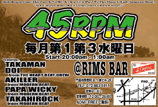 今年も残すところ後2回! 水曜恒例! ゆっくりまったりレゲエ! =45RPM= 第1・3水曜日 @RIMS BAR Featuring... TAKAMAN DOI from The Heart Beat Crew PAPA WICKY from Modern Beat TAKAHIROCK from Modern Beat AKILLA from Modern Beat 入場&チャージ無料! Start.8:00pm-1:00am RIMS BAR 門真市野里町8-1 東ビル 2F Tel.072-883-5911 ゆっくりまったり開催中♪