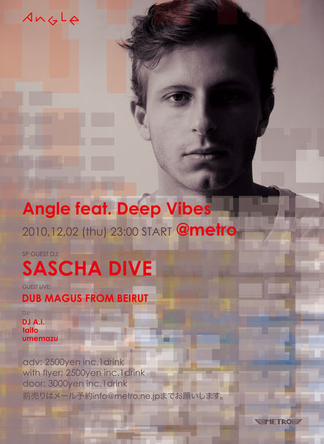 Angle feat SASCHA DIVE 2010,12,02 (thu) 23:00open/start @metro http://www.metro.ne.jp/schedule/2010/12/02/index.html adv: 2500yen inc.1drink / with this flyer: 2500yen inc.1drink / door: 3000yen inc.1drink 前売りはメール予約info@metro.ne.jpまでお願いします。 SP GUEST DJ: SASCHA DIVE (Deep Vibes) GUEST LIVE: DUB MAGUS FROM BEIRUT DJ: DJ A.I. taito umemazu VJ: moairoq 2010年、Matthew Herbert、POLE & DEAD BEATなどの著名アーティストやChris Carrier、Margaret Dygasといった通好みのアーティス