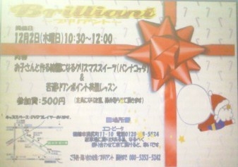 Brilliant クリスマスイベント 日時 12月2日(木曜日)10:30〜12:00 場所 東舞鶴(溝尻)陽だまりカフェ 内容 お子さんと作る綺麗になるスイーツ(パンナコッタ) 天国からの贈り物と言われる果物のジュース をソースに使います & イベントシーズン