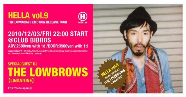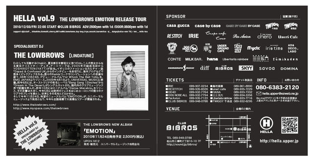 管理人さま失礼いたします。 お待たせしました〜イベント"hella"開催です。 今回はエレクトロで現在注目株の"THE LOWBROWS"がニューアルバムのツアーで初来松!!ロック、ハウスなどのクラブシーンからの注目にとどまらずファッション業界などでも取り上げられる機会の多いアーティストですが、今回の全国ツアーでは四国はココ松山のみ!! 今回も市内中心の沢山のお店様にもご協賛という形でサポートしていただいておりますが、今回からもまた新しいお店様にも続々と参加していただいて、盛り上がりを感じています。 今年はラストの
