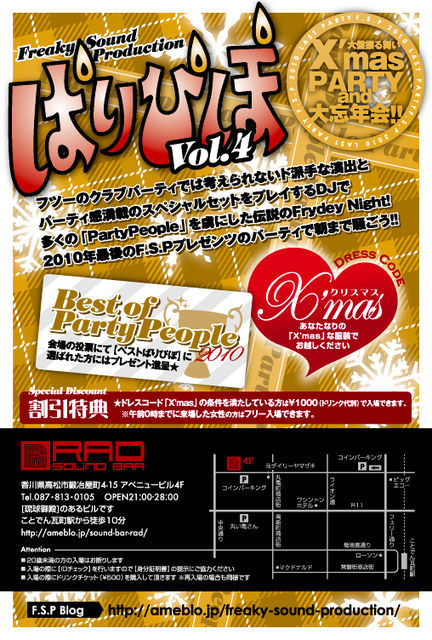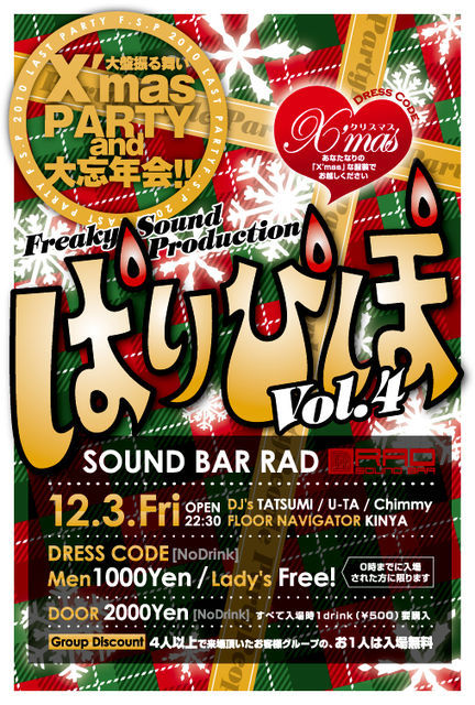 FREAKY SOUND PRODUCTION PRESENTS PARTY PEOPLE 「ぱりぴぽ」vol.4 〜FSP 2010 LAST PARTY X'mas&忘年会 大盤振る舞いパーリー〜 2010/12/3 Fri 22:30START @RAD DJ U-TA DJ TATSUMI DJ Chimmy FLOOR NAVIGATOR KINYA FEE:1500yen(no drink) DRESS CODE:X'mas <ぱりぴぽ SPECIAL DISCOUNT> ・DRESS CODE DISCOUNT ドレスコードでご来場のお客様は1000yen(no drink) さらに!!!!! ドレスコードで0時までに入場の女性は入場タダ!!!! ・GROUP DISCOUNT 4人以上のグループでのご来場で、その内の一人は入場料タダ!