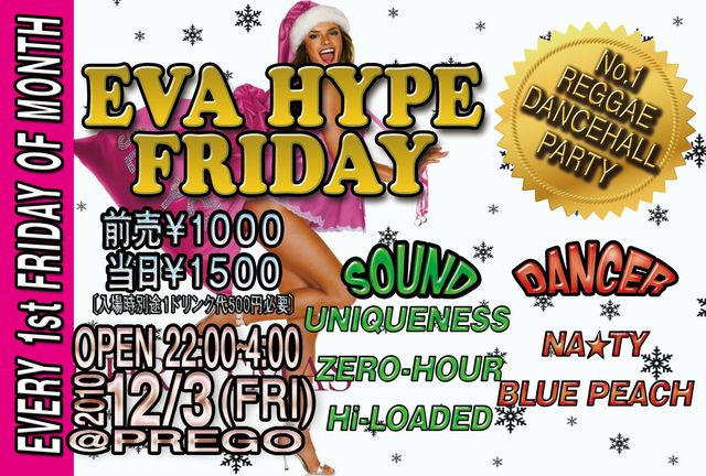 ■毎月第1金曜日! EVA HYPE FRIDAY (エバ ハイプ フライデー) 「誰もが自由に遊べて楽しめるダンスホール」 をテーマに 和歌山 プレゴにて大好評開催中!!! ■レゲエの現場で流行中のダンスホールから 80年代、90年代のクラシック ミディアムの名曲など 「レゲエ」を中心に HIP-HOPやR&Bもお届けするので 幅広く楽しめるDANCEHALL REGGAE PARTY ■始めの時間はオールディーズや ファンデーションはもちろん R&Bにラバーズやカバーズが流れるので オシャレなクラブで ゆっくり心地いい音楽を楽しみ