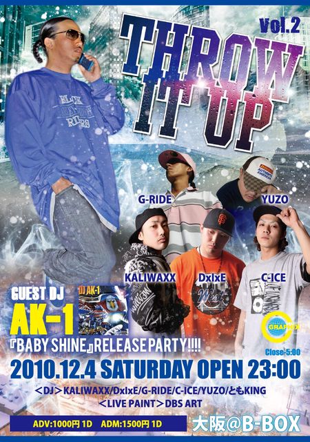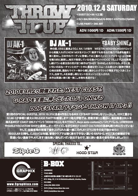 管理人様 告知失礼致します。 不適切であればお手数おかけいたしますが、削除してくださいm(__)m 2010年9月より開催されたWEST COAST.G-RAPを全面に押し出したDJ's ONLYのDOPEなPARTYイベント『THROW IT UP』!! 第2回のGUESTは、2010.10.31に自身4作目となるMIX CD『BABY SHINE』をリリースした、059三重からDJ AK-1が参戦!!盛大にRELEASE PARTYを開催します!! 地元伊勢では、奇数月第3土曜日に、毎回集客200人を越えるWEST COAST ONLYイベント『HOOD VILLE』をATTRACT、Boys auto customといったアパレル、LOWRIDERやHARLEYのC