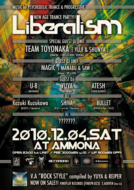管理人様告知失礼致します。 2010/12/4/(土) 東心斎橋@アンモナ NEW AGE TRANCE PARTY!! ▲▽ - Liberalism - 1st Anniversary - ▽▲ □DAY:2010/12/04(SAT) □PLACE:at AMMONA □TIME:23:00-LAST □ MUSIC:PSY TRANCE/ PROGRESSIVE □FEE:¥3000-1D W/F:¥500-OFF 〓SPECIAL GUEST DJ SET〓 ■TEAM TOYONAKA [YUJI & SHUNYA] (YABAI REC./FIXX/L.P.S/AMBIVALENTREC. & EL-CREW/EXTREME/S-L-N) □http://www.881-rec.com/ 〓GUEST DJ UNIT〓 ■MAGIC [MANABU.BalancE/YRC & SAW.FIXX] □http: