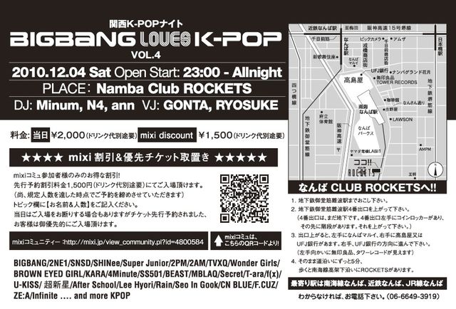 今年最後の関西K-POPイベント!!! --------------------------------------------------------------- ☆関西K-POPイベント『BIGBANG loves K-POP』!! BIGBANG以降のK-POPシーンや今年も盛り上がりを見せているガールズ・グループ等をメインにしたクラブでのオールナイト・パーティー! 少女時代の"GEE"やKARA、2NE1などで一緒に振り付けを思いっきり踊りたい方も是非是非×2 2回、3回と足を運んでるうちに顔馴染みが増えて、より一層に楽しくなるのがクラブイベントの良い所です!是非、みなさまの遊び場のホームとして楽しんで下