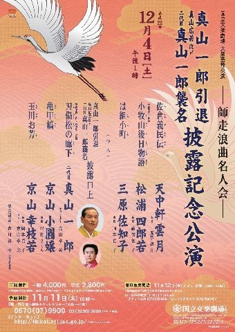 『師走浪曲名人会』 真山一郎引退、真山広若改〆二代目真山一郎襲名披露記念公演 【会場】国立文楽劇場 【日時】2010年12月4日(土)、午後1時開演 【番組】 『佐倉義民伝』 天中軒雲月、曲師・一風亭初月 『小牧山後日物語』 松浦四郎若、曲師・藤信初子 『は組小町』 三原佐知子、曲師・岡本貞子 ―仲 入― 『真山一郎引退、真山広若改〆二代目真山一郎襲名披露口上』 真山一郎、二代目真山一郎、天中軒雲月、三原佐知子、松浦四郎若、京山小圓嬢、