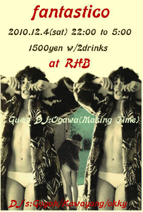 『FANTASTICO』 日時:2010.12.04(土)sat 22:00 to 5:00 1500yen with 2drinks 場所:日本橋 RHB [ゲストDJ] ●OGAWA (Making Time!) [DJ] ●GOYAH ●KAWAYANG ●OKKY OGAWA(MAKING TIME) 「HAMMERKIN A GO GO」や「MAKING TIME」を主催し、長年にわたり大阪のモッズ・シーンを引っ張り続けてきた張本人。各地のモッズ・メーデーにも出演し、激レアなブリティッシュ・ビートのナンバーやソウル7インチに常に厚い信頼と喝采を集めるプレイを行う。彼のプレイが今年聴けるのはファンタが最後です(