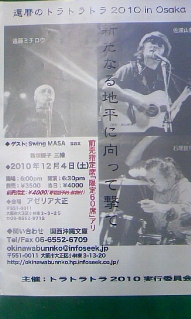 1941年12月8日 真珠湾奇襲 Tora Tora Tora 1950年12月8日 佐渡山豊誕生 1980年12月8日 ジョンレノン暗殺 守っても守りきれない平和 沖縄の基地は、取りあえず大和に戻し 平和を鍛えるために今私たちに何が出来るか 今年は、還暦のトラが3人そろう まさに 寅 寅 寅 の寅年の暮れ 2010・12・4 Sat. @アゼリア大正 新たなる地平に向かって撃て! トラトラトラ 2010 in Osaka 出演 佐渡山豊 石塚俊明 遠藤ミチロウ ゲスト;Swing MASA sax 新垣優子 三線 前売;\3500 当日;\4000 →前売