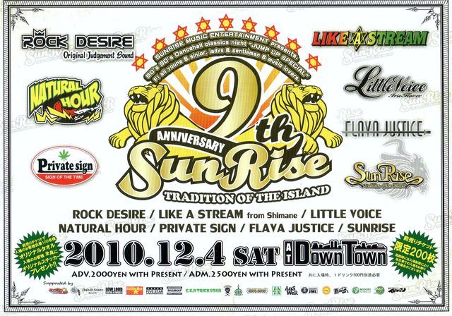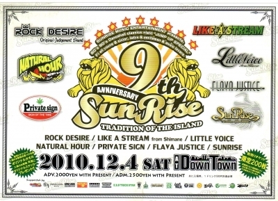 2010/12/4/SAT ☆ Sunrise 9th Anniversry ☆ 【出演】 ◎Rock Desire ◎Like a Stream from Shimane ◎Little Voice ◎Natural Hour ◎Private Sign ◎Flava Justice ◎Sun Rise @DOWN TOWN 泉大津市若宮町10-7B1F TEL0725-27-0400 http://www.downtown-web.net ADV 2000/1Present ADM 2500/1Present OPEN:23:00〜 皆でSUNRISEの9周年を祝いましょう! 前売りチケット希望の方はメッセージにてお願いします♪♪