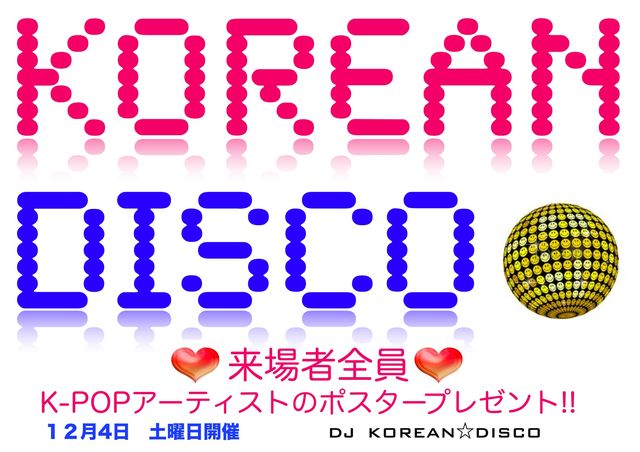 管理人様告知失礼致します。 なんと全員にK-POPアーティストのポスターをプレゼント 詳細です↓ 【イベント名】 KOREAN DISCO 【日時】 12/4 土曜日 【場所】 心斎橋Club LOUNGE LUXE 大阪市中央区東心斎橋1丁目15番22号 第一KSビル4F TEL:06-6241-4949 【時間】 8:00-5:00 【料金】 1500yen/1d 【K-POP DJ】 KOREAN☆DISCO KOREAN☆DISCOがプロデュースする週末K-POPの大本命イベントが開催決定!! なんと来場者全員にK-POPアーティストのポスターをプレゼント!! かか