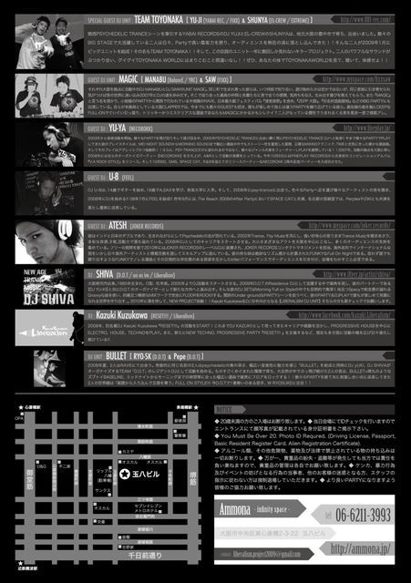 管理人様告知失礼致します。 2010/12/4/(土) 東心斎橋@アンモナ NEW AGE TRANCE PARTY!! ▲▽ - Liberalism - 1st Anniversary - ▽▲ □DAY:2010/12/04(SAT) □PLACE:at AMMONA □TIME:23:00-LAST □ MUSIC:PSY TRANCE/ PROGRESSIVE □FEE:¥3000-1D W/F:¥500-OFF 〓SPECIAL GUEST DJ SET〓 ■TEAM TOYONAKA [YUJI & SHUNYA] (YABAI REC./FIXX/L.P.S/AMBIVALENTREC. & EL-CREW/EXTREME/S-L-N) □http://www.881-rec.com/ 〓GUEST DJ UNIT〓 ■MAGIC [MANABU.BalancE/YRC & SAW.FIXX] □http://