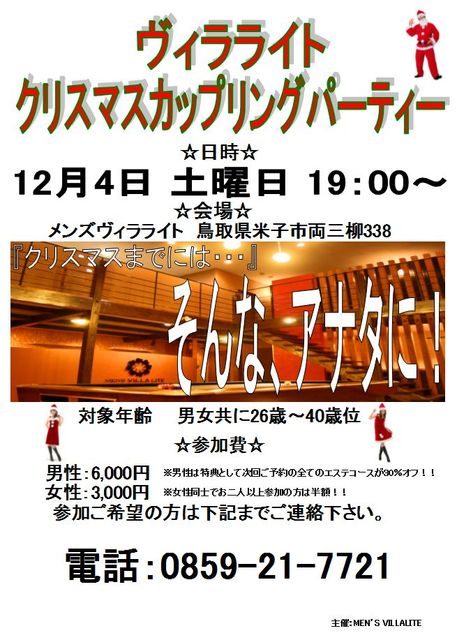 『クリスマスを一人で過ごしたくない!』 『山陰の冬をパートナーなしで過ごしたくない!』 そんな声から2ヶ月の沈黙を破って復活しました! 今回は二次会会場もあり! ぜひぜひ、お誘いあわせの上ご参加下さい! 質問、疑問もメールで承ります、もちろん電話でもOK! 日時:12月4日(土) 19:00〜 会場:メンズヴィラライト(地図→http://otoko-bigaku.com/map.html) 対象年齢:男女共に20代〜40歳位まで 参加費:男性:6000円(男性は特典として次回ご予約のエステコースが30%オフ!!) :女性:3000