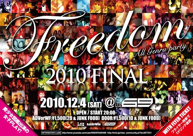 FREEDOM2010 FINAL GENRE:ALL GENRE ■2010/12/4 SAT ■OPEN / START 20:00- ■ADV \ 1500(2D & JUNK FOOD) ■DOOR:¥1,500(1D & JUNK FOOD) (With FlyerにてADV対応させて頂きます!) ■DJs ヒットミー (…美少女図鑑1st出演の綺麗な女のコ) MIKURI (mixiネームは 3っ9り 若きCLUB people ) kiki (鳥取を代表するB-Girl ) セルビア (ご存知、ROCK CRIMEのメガネ環大生。 大手出版社への就職が決ま