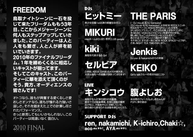 FREEDOM2010 vol.10 GENRE:ALL GENRE ■2010/12/4 SAT ■OPEN / START 20:00- ■DOOR:¥1,500(2D & JUNK FOOD) ■DJs ヒットミー (…美少女図鑑1st出演の綺麗な女のコ) MIKURI (mixiネームは 3っ9り 若きCLUB people ) kiki (鳥取を代表するB-Girl ) セルビア (ご存知、ROCK CRIMEのメガネ環大生。 大手出版社への就職が決まっております!) THE PARIS (…DJ miyuki & VJ kensuke) (DJ miyuki & VJ kensukeによるNEW ROCKユニット【THE PARIS】