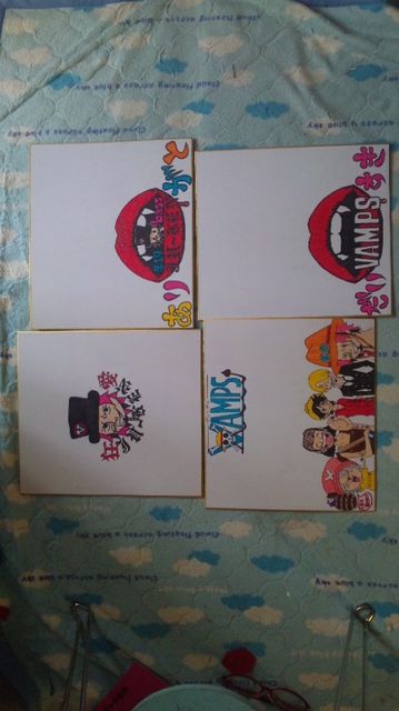 こっちの方に書き直しましたw VAMPS狂愛の皆さんっ! 皆さんに協力してほしいです! 代々木にてVAMPS宛の色紙を 企画して会場にいますので、 もし時間ありましたら 是非VAMPSへの熱いメッセージ を書いて下さい(・∀・)ノ 会場に行けない方には代筆 もしますので、気軽にメッセ 送って下さい(´∀`人) それと並行してJu-ken狂愛者限定 の色紙も企画してるので、 Ju-kenへの愛を書いて下さい♪ みんなでこの色紙を埋めて 無事メンバーの元へ旅立ってほしい! 一言でも長文でもいいです! プリクラ貼りたい人もOK! 派手派手にデコッてもOK! 代