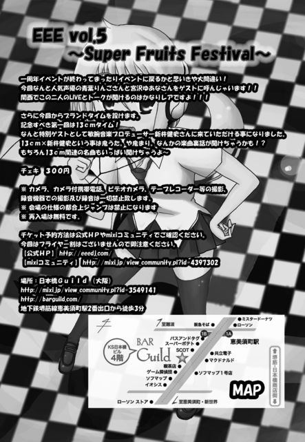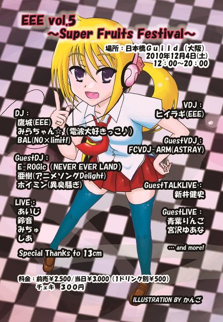 EEE vol.5〜Super Fruits Festival〜 2010年12月4日(土) 12:00〜20:00 料金:前売¥2,500/当日¥3,000(1ドリンク別¥500) 場所:日本橋Guild (大阪) http://barguild.com/ DJ: 鷹城(EEE) みらちゃん☆(電波大好きっこ♪) BAL(NO×limit!) GuestDJ: E-ROGic(NEVER EVER LAND) 亜樹(アニメソングDelight) ホイミン(異臭騒ぎ) VJ: ヒイラギ(EEE) GuestVDJ: FCVDJ-ARM(ASTRAY) Live: あいじ 鈴音 みちゅ しあ 草地未奈美 GuestTALKLIVE 新井健史 GuestLive: