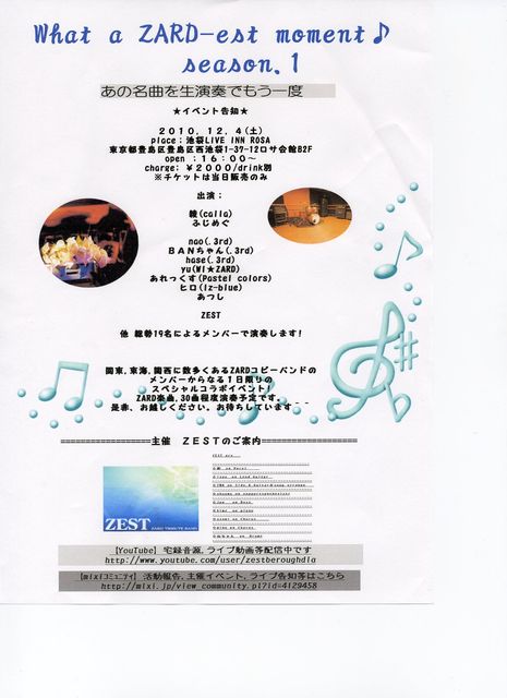 お待たせしました、ZARD仲間による夢のコラボ企画のご案内です。 …あの名曲を生演奏でもう一度… ◇全国に数あるZARDコピーバンドのメンバー達が同じステージでZARDの名曲の数々を演奏する,1日限りのスペシャルコラボイベント◇ ◆What a ZARD-est moment♪〜season.1〜◆ 主催:ZEST ◇池袋LIVE INN ROSA 東京都豊島区西池袋1-37-12 ロサ会館 B2F 03-5956-3463 -日時- 2010,12,4(土) ・開場 PM16:00 ・開演 PM16:30 3時間程度の演奏になります -チケット- ¥2000/1drink別