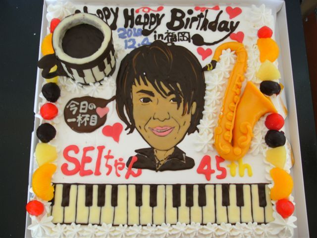 【完成報告】 最終的に75名もの方々にご参加いただきました! そして、ケーキとメッセージ集が完成し、 発送作業が終わりましたのでご報告いたします。 どんな中身になったかの詳細は写真とこちらをご覧ください。 http://mixi.jp/view_diary.pl?id=1633234878&owner_id=1314155 参加してくださった皆様、本当にありがとうございました!! ====下記募集時文面==== 12月4日福岡公演初日はGLAYのサポートキーボードSEIちゃんのお誕生日です。 そこで「似顔絵ケーキ」と「誕生日メッセージ集」を贈ろうと思っています。 メッ