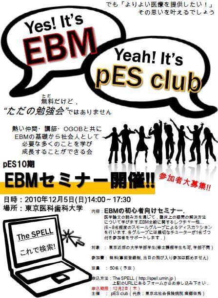 他学部と一緒に勉強することで,看護とは?看護の専門性!がみえてきて もっともっと看護が楽しくなる!!そんな勉強会のご案内. 毎年恒例pES-clubの【EBM Seminar】のご案内をお送りします. ( http://spell.umin.jp/ ) EBMって聞くと,気が引けてしまうあなた!にお勧めです. 学部・学年を超えて,楽しくEBMから社会人としてのマナーまで学びましょう. 無料(ただ)だけど,"ただ”の勉強会じゃない! これがpES-clubです. 人生を変えるくらいの,素敵な仲間,先輩,講師陣との出会いがありますよ. たくさんのご応募お待ちしてお