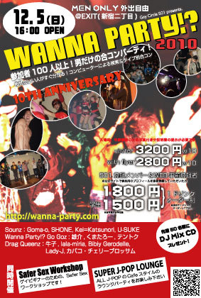 イベントの告知失礼いたします。 ◆◆100人合コン Wanna Party!? 2010◆◆ http://wanna-party.com/ 今年で10周年を迎える、ゲイサークル501主催の100人合コンパーティです! 「年上好き・年下好き」「タチ・ネコ」等タイプ別に分かれてグループ合コンを行うので、相手のタイプも分かりやすく、自分も相手の好みに当てはまる確立が高くなります。 つまり、他のイベントとはデキ率が違います! 未成年も入場可能。(アルコールの提供は20歳以上の方のみ) 学割もあります。 事前にプロフィールの登録をしていただくと、10周年特別割引料金