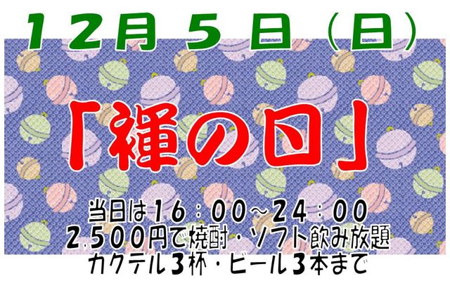 木枯らし1号も吹き、一の酉もおわり今年もあとわずかになってきました、 そろそろクリスマスや年末年始の予定が聞こえてくる季節になりましたね。 師走の12月は忘年会やパーティー、年内残務整理等 ストレスが多くなったり、なにかと忙しい方も多いのではないかと思いますが、 みんなで『スナック光』の『褌の日』で 褌一丁で飲んで、歌ってみんなで騒いで、ストレスの発散をしませんか? ってことで、12月も月一恒例の『褌の日』を下記の日程で開催しま〜す。 次回は『12月5日』に開催♪ 開催時間は前回同様16