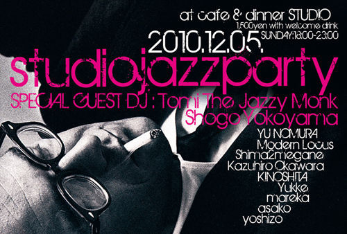 渋谷cafe & dinnerスタジオにて12月から新しいPARTYが始まります。偶数月第一日曜日、18:00から23:00頃まで。初回はTomi The Jazzy Monk、SHOGO YOKOYAMAをはじめ、都内のイケてるジャズ系DJが大集合。お誘い合わせの上、是非いらしてくださいね! STUDIO JAZZ PARTY 2010.12.05.SUNDAY 18:00-23:00 [at] cafe & dinner スタジオ(渋谷) [blog] http://www.studiojazzparty.com [twitter] http://twitter.com/#!/studiojazzparty [SPECIAL GUEST DJ] Tomi The Jazzy Monk (Jazz for Dancers) SHOGO YOKOYAMA [GUEST DJ] Kazuhi