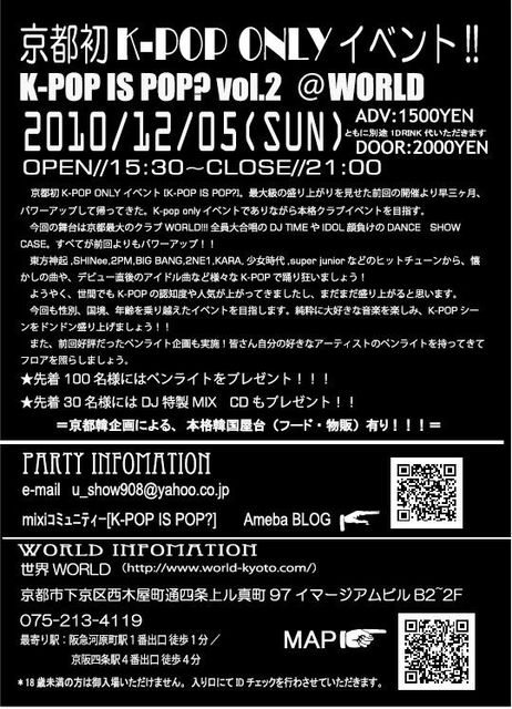 京都初K-POP ONLY イベント[K-POP IS POP?]。最大級の盛り上がりを見せた前回の開催より早三ヶ月、パワーアップして帰ってきた。K-pop onlyイベントでありながら本格クラブイベントを目指す。
