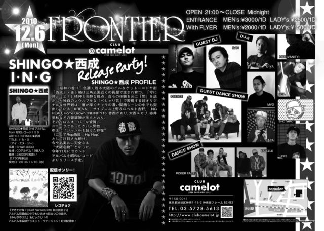 管理人様告知失礼します!!! 迷惑でしたら消去もしくはメッセージ頂けたらありがたいです!!! 12月6日(月)CLUB CAMELOTにて前回平日で400人近く入ったEVENT『FRONTIER』に 今回はなんとなんと来年上映される映画などにも出演し関西では知らない人はいないであろうこの人!!! 『SHINGO★西成』 NEW ALBUM『I・N・G』RELEASE PARTYをやります!!! 東京でのRELEASE PARTYはココだけです!!!お見逃し厳禁!!!なかなか見る事のできない『SHINGO★西成』の激アツなLIVEは絶対見なきゃ損です!!! 満を期して『SHINGO☆西成』3年半ぶりの待望のNE