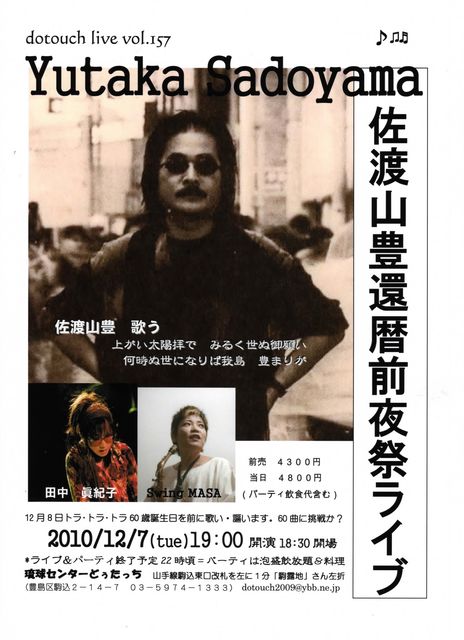 12月8日、60歳誕生日の前日はどぅたっちでの前夜祭ライブです。 30名でいっぱいになる小さなスペースですが、ホームパーティのようなライブを楽しんでください。 参加費 4300円(予約) 当日は4800円です。 (飲み放題の泡盛と、パーティの料理含む) 59年に一回の、佐渡山さん還暦前夜を、共有しましょう。 60曲に挑戦の声も、聞こえています。 ご予約お待ちしています。 琉球センター どぅたっち 山手線駒込駅東口から徒歩2分 03−5974−1333 dotouch2009@ybb.ne.jp