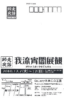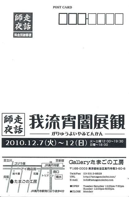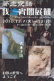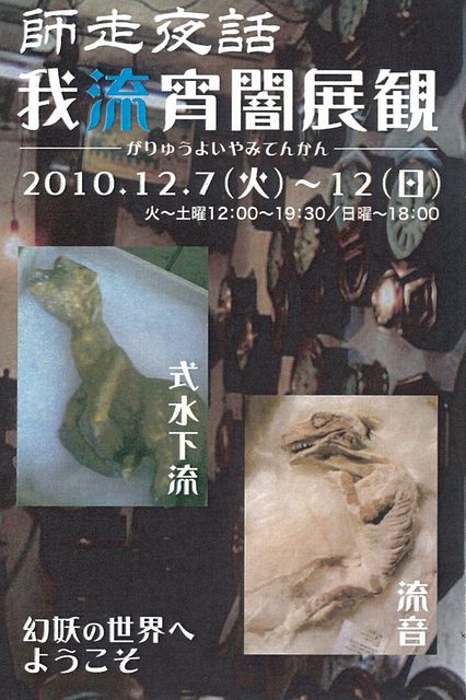 〜師走夜話〜 我流宵闇展観 2010.12/7(火)〜12/12(日) 火曜〜土曜日12:00〜19:30 日曜日〜18:00 場所:たまごの工房 〒166-0003 東京都杉並区高円寺南3-60-6 TEL/FAX 03-3313- 8829 http://tamagonokobo.com/ 瓶(箱)詰めの妖怪作品で有名な式水下流氏(うわん工房:http://mixi.jp/view_community.pl?&id=3775473)とワタクシ“嘘んこ博物屋”の流音(幻妖商会:http://mixi.jp/view_community.pl?id=5269637)が妖しい怪しい作品展をやりますよ。 御近所お誘い合わせの上、小さな見せ物小屋にいらしてくださいませ。