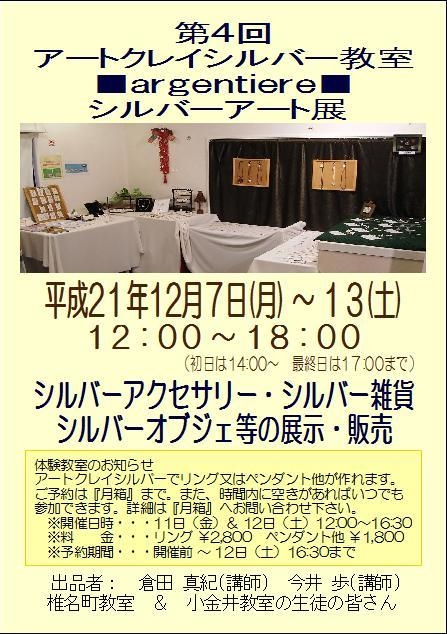 今年もアートクレイシルバー教室 ■argentiere■(アルジェンティエーレ)の シルバーアート展を開催します。 アートクレイシルバー(銀粘土)を中心に作製したアクセサリーや雑貨等の展示・販売です。 今回も昨年同様、当教室の生徒さんの作品も展示だけではなく販売も致します。 腕の上がった皆さんの作品をジックリ見て、良かったらご購入して行って下さい♪ そして、今年もリング、ペンダントの体験教室を行います。 作製時間:リング 1ヶ 約2時間〜2時間半 ペンダント他 1ヶ 約1時間〜1時間半 参加費用:リング 1ヶ ¥2,80