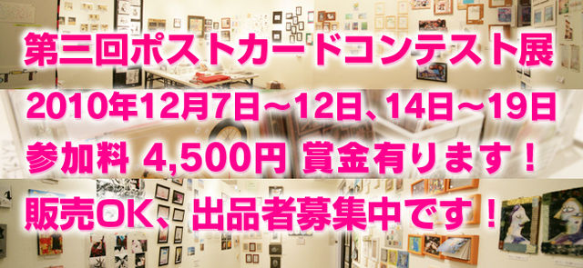 前回、一週間で700人もの来場があり大好評だったポストカードコンテスト展、第三回を開催致します。 気軽にギャラリーでの展示や、投票による来場者とのコミュニケーション、販売による作品のやりとりを体験していただくことをコンセプトとして始めた企画展です。 会期は2010年 前半:12月7日(火)〜12日(日) 後半:12月14日(火)〜19日(日) 開場時間 13時〜20時(最終日は19時迄・販売は18時迄)(月曜日搬入) 今回は二週間の期間を一週づつに分け、入れ替えを行います。 投票により第1位の作家さんには、賞金1万円、2位は5,000円、3位