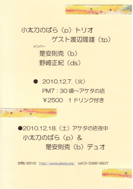 のばらさんからのライブのお知らせです (↑上記の写真はクリックすると拡大されます) 『暖かい秋でしたが 少しずつ寒さも増し 紅葉も深まって参りました。 皆様 お元気にお過ごしでしょうか? さて 2006年9月より再結成した私のトリオも はや5年目を迎えました。 現在も続けてトリオの演奏を行っておりますが よりいろいろなすばらしいミュージシャンの影響を受けたいと思い 今年2010年夏より 不定期ですがトリオにゲストをお迎えしています。 第一回目は すばらしいアルトサックス林栄一さんをお迎えして演